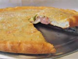 A sauceless pie topped with ricotta, mozzarella, and parmesan cheese.